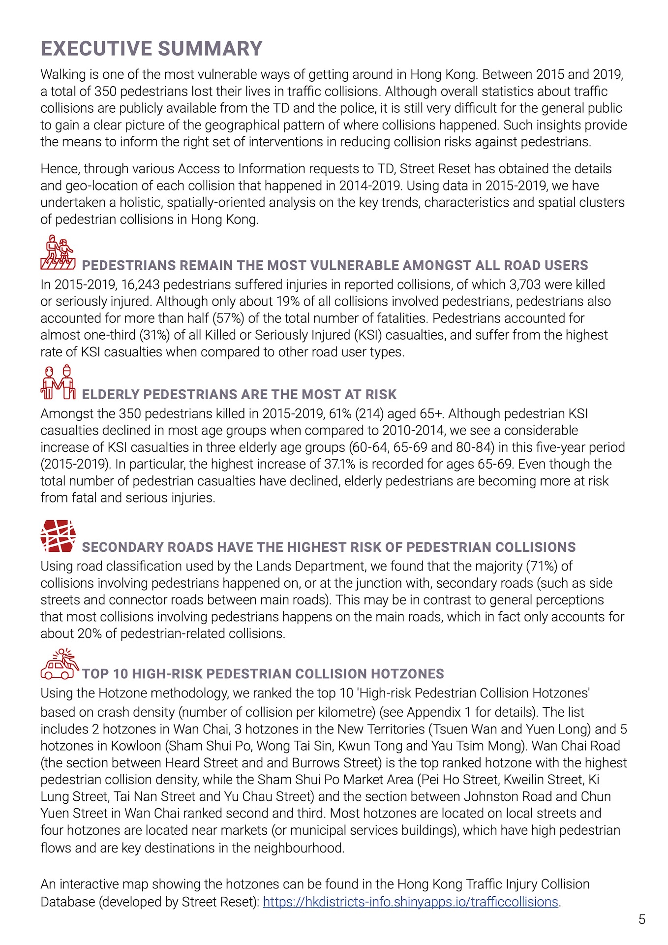 除了此資料庫網站,街道變革亦於 2022 年 8 月發佈了**《交通意外不是意外 —— 香港行人車禍傷亡報告》**。該報告有兩項目的: