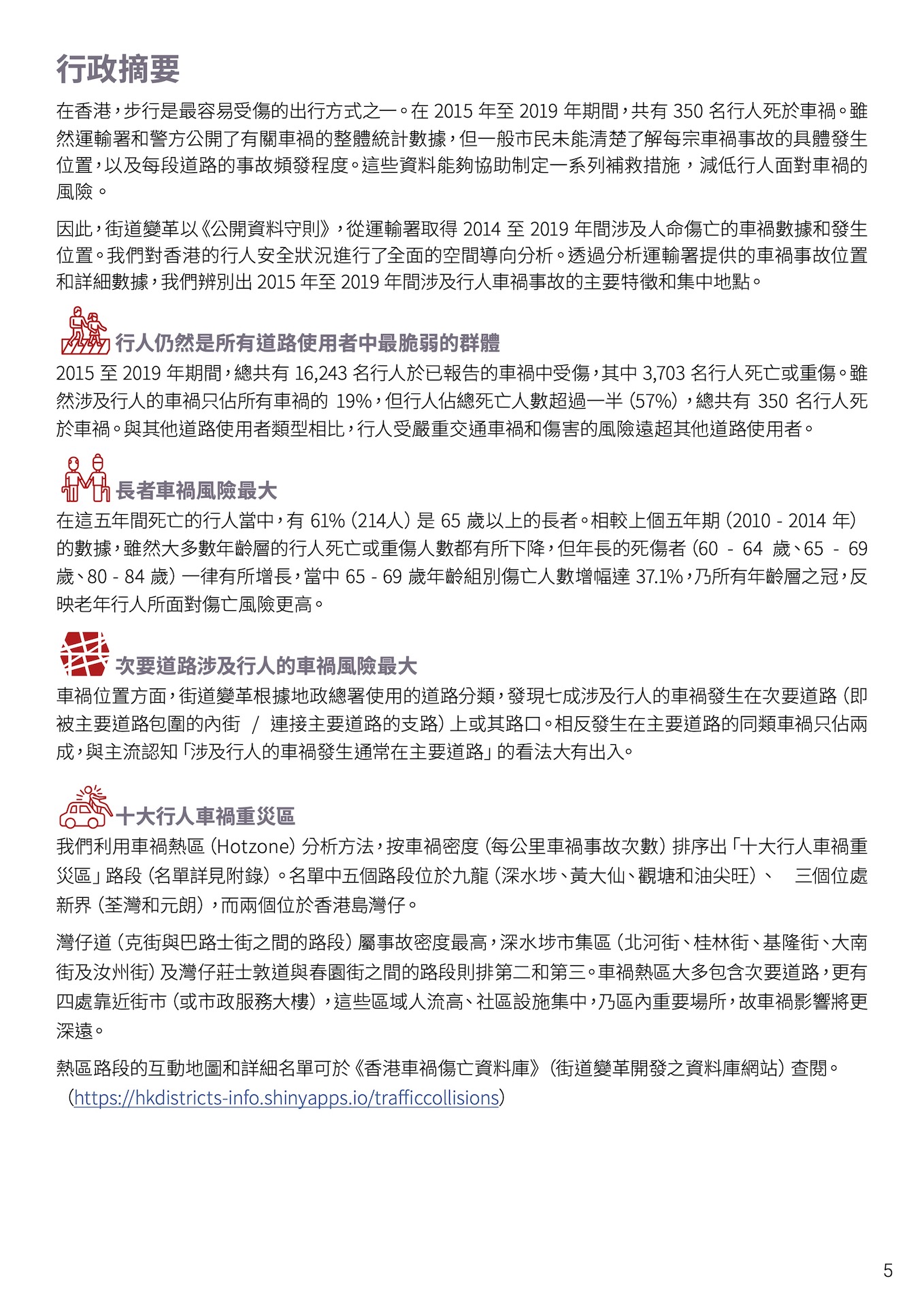 除了此資料庫網站,街道變革亦於 2022 年 8 月發佈了**《交通意外不是意外 —— 香港行人車禍傷亡報告》**。該報告有兩項目的: